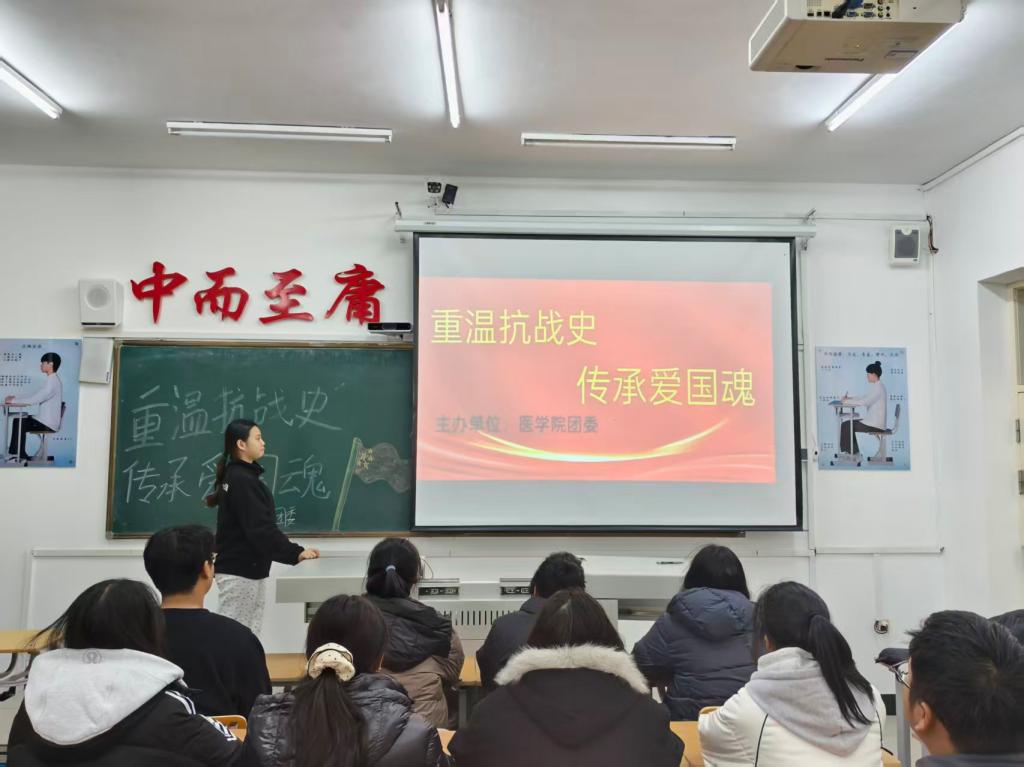 为引导学生感悟革命先辈的家国情怀与奉献精神,医学院团委于11月11日在一号教学区1211教室组织开展“重温抗战史,传承爱国魂”主题活动,本次活动由柳秋茹主持,医学院各级学生参加。