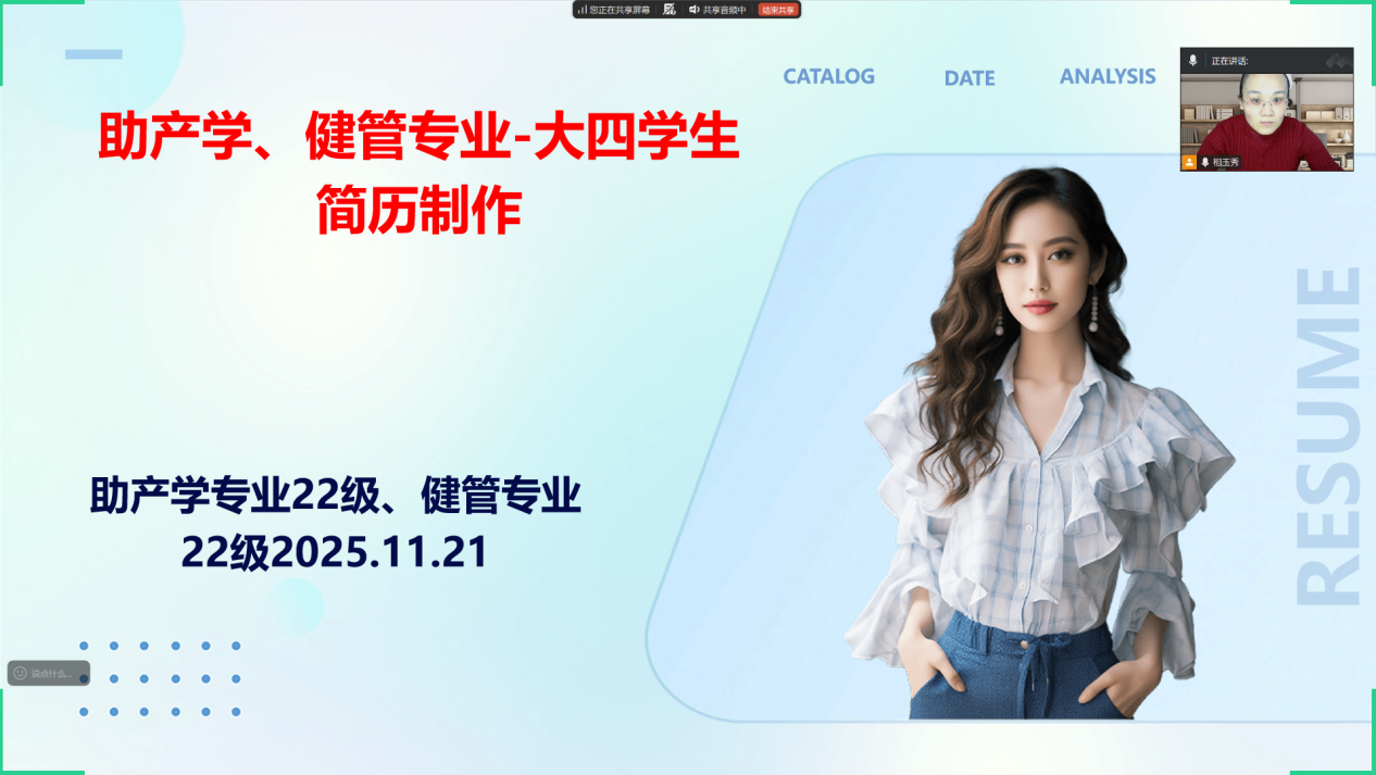 为切实提升毕业生求职竞争力,精准对接就业市场需求,11月7日,助产学专业相玉秀老师面向助产22级董金阳、宋旺、袁闰同等9名学生及健康服务与管理专业22级胡家莹、闵雪、刘欣誉等8名学生,开展精美简历制作专项指导活动,以专业赋能为学生就业保驾护航。