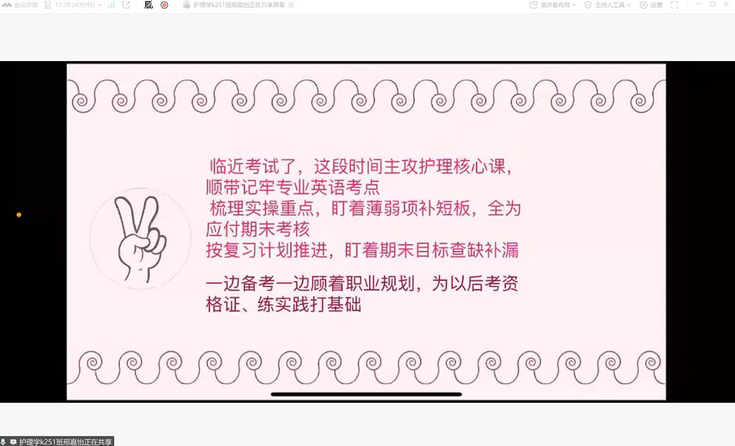会议伊始,护理学K251班刑嘉怡同学结合自身经历进行十一月生活分享,她从课堂学习、社团活动、日常作息等方面,客观讲述了自己本月的学习生活状态,既分享了合理平衡学习与活动的经验,也坦诚剖析了自身存在的时间分配不足等问题,为同学们提供了可借鉴的生活参考。在学生分享结束后,尹娜老师结合期末备考需求,为全体同学开展复习方案指导,她提出要根据自身学情分层制定复习计划、聚焦学科内容强化重难点突破、科学规划作息做好时间管理、通过定期自测检验复习效果,帮助同学们搭建起系统的备考框架。