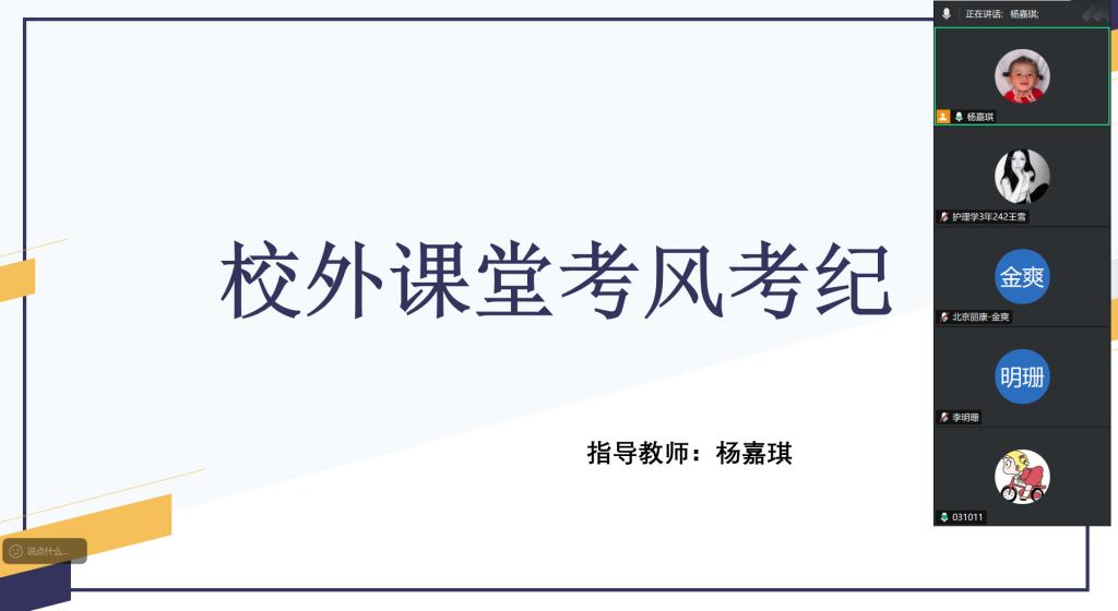 为保障校外课堂学生的人身安全与学习秩序,强化学生校外实践期间的安全防范意识和应急处置能力,11月1日下午,医学院教师杨嘉琪组织昆山国宾体检中心和桐鑫口腔门诊校外课堂的全体学生,以线上的形式召开考试考风考纪会议。