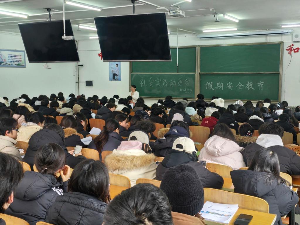 杨嘉琪老师围绕近期学生事务与假期安排逐项说明。她首先强调离寝安全,提醒同学们在离校前须将个人物品收纳整齐,妥善保管贵重物品,完成寝室断电、闭窗、锁门等检查,防止财物丢失。关于考试纪律,她要求全体同学务必携带准考证与身份证参加考试,严格遵守考场规定。在助学金发放方面,杨嘉琪老师通知已获助学金的同学需及时办理并激活黑龙江省社保卡,确保资助款项顺利发放。针对即将开展的社会实践学期,她要求同学们认真完成实践任务,积极参与各项安排,并按时提交相关材料。对于假期安排,她特别提醒注意出行安全,主动与家长保持沟通,提前报备行程。最后,杨嘉琪老师就校园冬季扫雪工作作出动员,要求在校同学如遇雪情积极响应学院组织,参与集体扫雪劳动,共同维护校园环境安全。