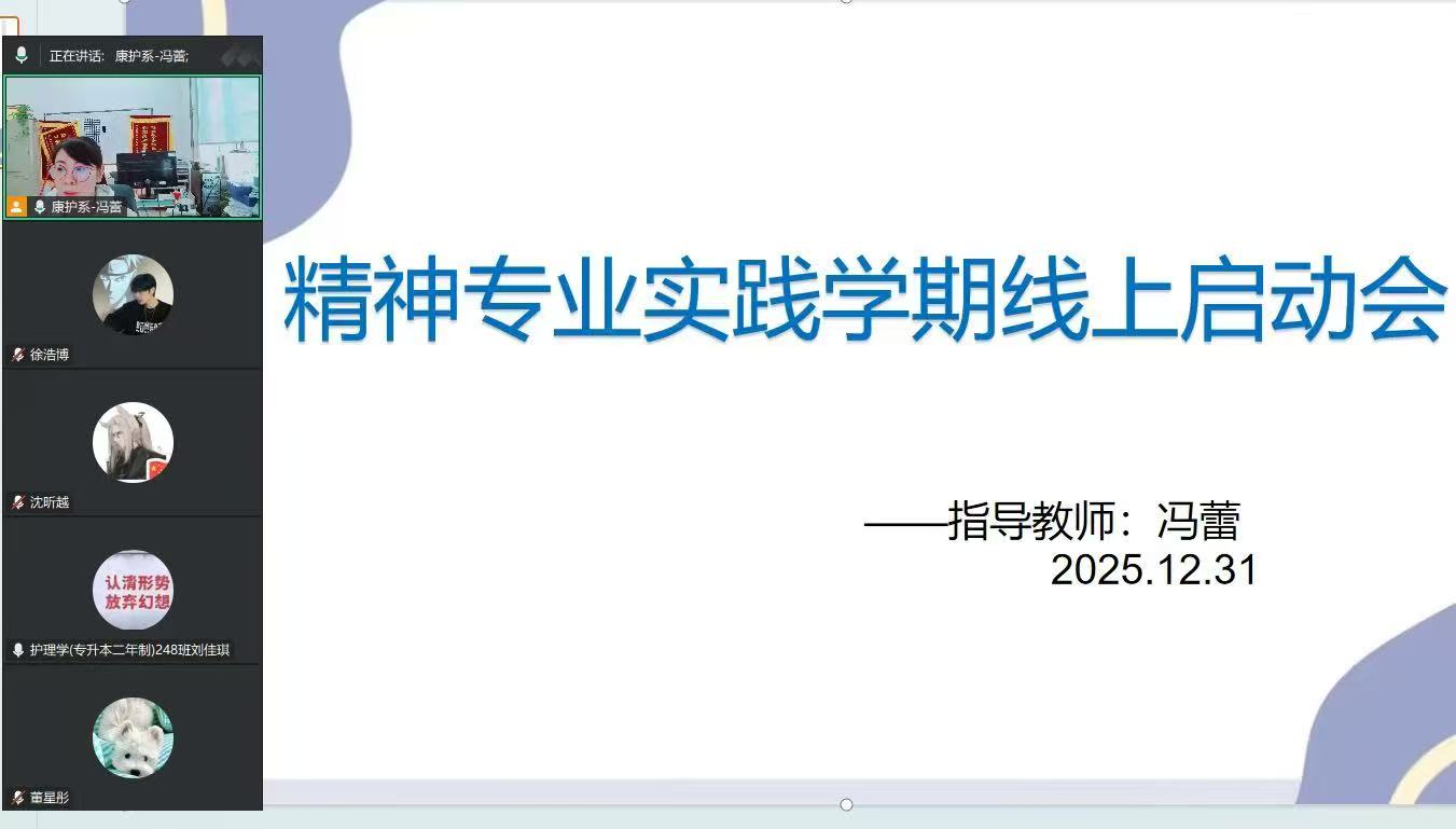 为了明确精神护理专业实践学期的目标任务与核心重点,保障实践教学工作开展。2025年12月31日,冯蕾老师通过腾讯会议平台组织召开“精神专业实践学期线上启动会”,小组全体同学参加。