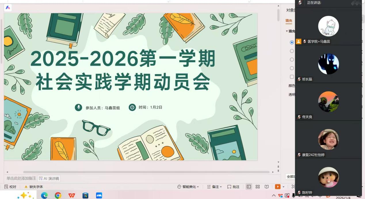 为有序推进社会实践学期各项工作,明确作业要求,引导学生高效完成实践学习任务,于1月1日,生涯导师马鑫蕊在线上主持召开社会实践学期专题会议。会议上,马鑫蕊老师着重强调了社会实践学期各项作业的重要性。她结合学业考核细则,明确各类作业是检验学生知识运用能力和实践素养的核心依据,更是学业合格的关键,叮嘱全体学生务必端正态度、认真对待,严谨落实每一项作业要求,杜绝敷衍应付,坚决杜绝挂科情况的发生,为后续学业发展筑牢基础。