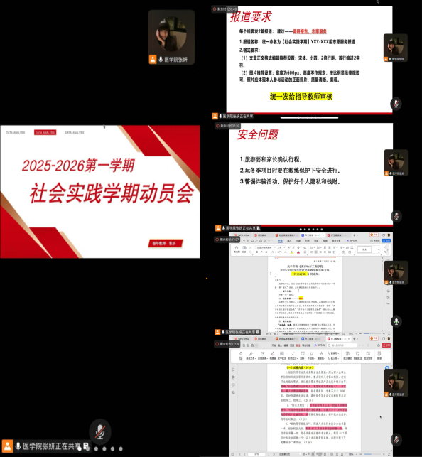 会上,张妍老师围绕安全问题、实践学期作业问题、报道撰写要求三大核心维度,对社会实践学期实施方案及补充通知展开详细解读。在安全层面,明确了社会实践学期间的人身安全、个人隐私等注意事项;针对作业问题,细化了不同实践项目的作业完成标准、提交时间与考核细则;对于报道要求,也清晰界定了内容规范、格式标准与提交渠道等。最后,张妍老师强调要按时按量完成并提交每周需完成的作业。