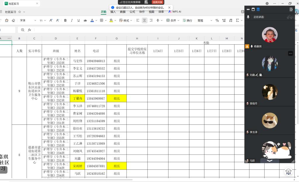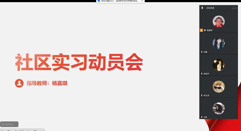 为有序推进社区护理实习工作,帮助同学们熟悉社区护理服务模式、明确实习任务与安全要求,2026年1月2日,杨嘉琪老师通过腾讯会议组织召开社区专业实践学期线上动员会,小组全体同学参加。