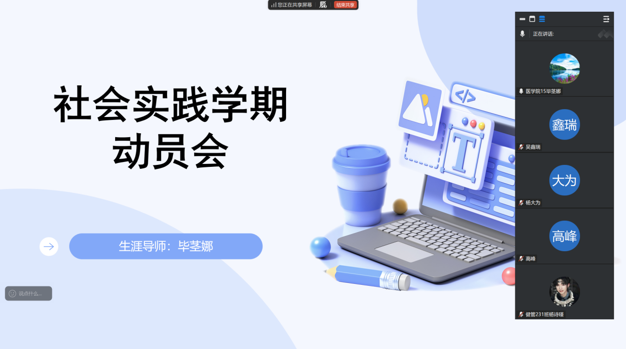 会上,毕茎娜老师首先向同学们系统讲解了社会实践学期的整体任务要求,明确了不同阶段的实践目标与完成标准。她指出,本次社会实践是衔接课堂理论与行业实践的关键环节,健康服务与管理、康复治疗学专业学生需结合专业特色,完成从调研策划到实践落地的全流程任务,同时强调了任务完成的时间节点与质量要求,让同学们对实践任务有了全面且具体的认知。