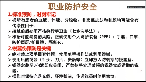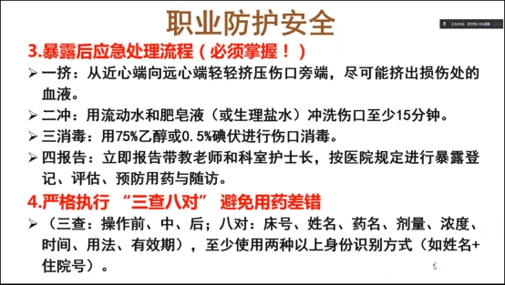 在职业防护与安全教育环节,张道勇重点提醒同学们在实习中必须做好个人防护,严格执行手卫生,佩戴手套、口罩,避免直接接触患者体液与血液。操作中需预防锐器伤,严禁双手回套针帽,所有锐器使用后须放入锐器盒。如发生针刺伤,应立即按流程处理并上报。用药前务必执行“三查八对”,非专业人员不得参与发药。