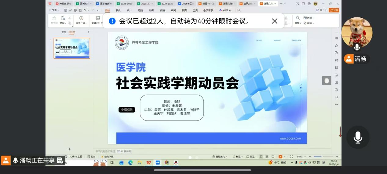 2026年1月4日于线上召开社会实践学期动员大会,本次会议由医学院生涯导师潘畅主持,为学生逐项拆解任务要求、明确完成路径,助力学生高效推进实践工作。
