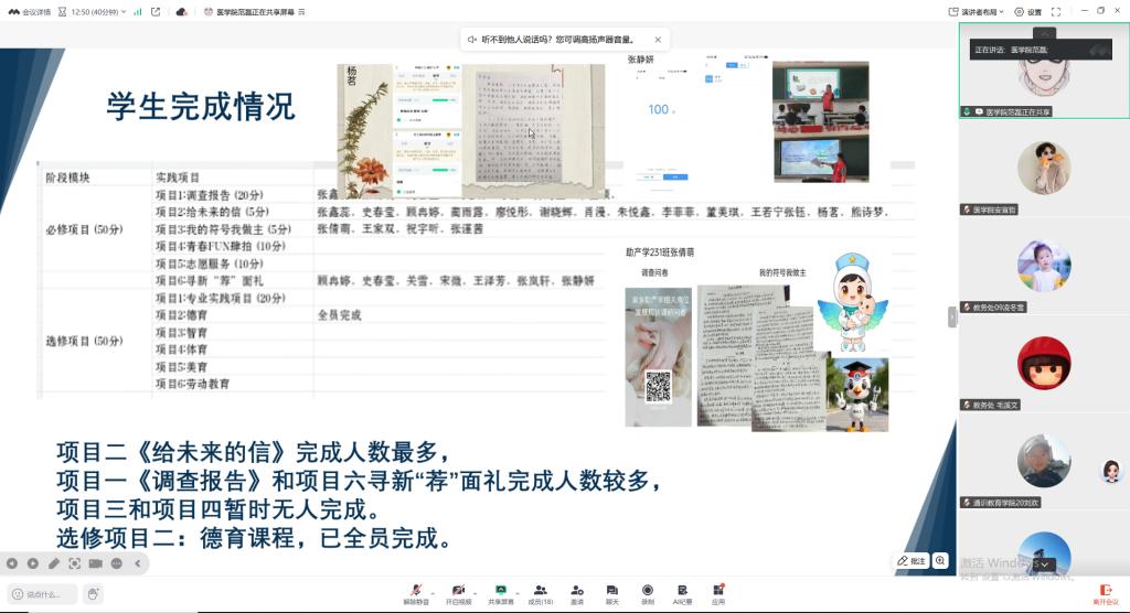 会议伊始,范磊老师进行了社会实践学期已完成工作的进度汇报。从汇报情况来看,学生们已按要求开展“给未来的信”“我的符号我做主”等实践任务,部分成果已完成展示与中期检查;志愿服务、青春FUN肆拍等实践模块也在有序推进,小组形式的志愿服务报道撰写工作已进入收尾阶段,为后续实践任务的全面完成奠定了基础。紧接着,针对通识内容中的德智体美劳教育学习环节,江丽娜老师重点强调德育、智育、体育、美育、劳动教育模块,需严格按照时间节点在学习通平台完成学习。各班需指定专人负责督促,确保每位学生按时完成学习任务,做到学习进度不滞后、学习质量有保障。最后,对于调研报告撰写工作,会议明确了具体标准:调研报告需严格按照6-7页的篇幅要求完成,内容需紧扣助产学专业相关调研方向,保证数据真实、逻辑清晰、分析深入。老师将按照该标准对每份报告进行细致检查,对不符合要求的报告将督促学生及时修改完善,确保调研报告能切实反映学生的实践调研能力与专业思考。此外,会议还对社会实践学期后续工作进行了详细部署,明确“给未来的信”需在1月11日前以楷书完成,并点对点提交、调研报告与青春FUN肆拍等项目,要求学生合理规划时间,保质保量完成各项任务。