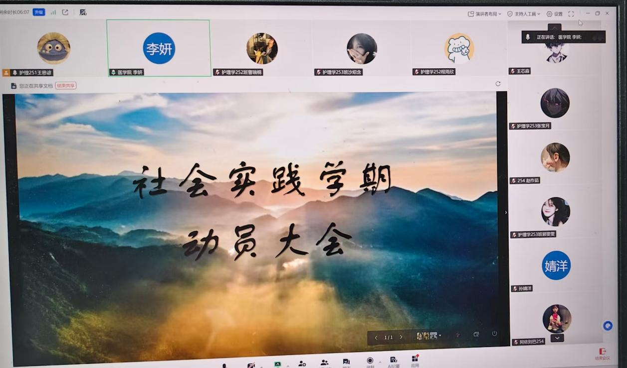 为引导大一护理学专业学生充分认识社会实践的重要意义,由11名学生组成实践小组。在辅导员统筹指导下于1月4日组织线上开展护理学专业大一社会实践学期动员大会。本次大会由辅导员主持,活动将引领学生主动在社会实践中深化对时代特征、国家发展与社会民情的认知,勇担时代责任。