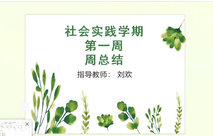首先,刘欢老师总结了本周同学们的作业情况,指出需要重视社会实践学期相关材料,合理规划实践学期各项任务。其次,刘欢老师组织组长进行发言陈述,组长总结本周工作并计划下周工作,同时询问各组是否在各项活动中有困难,以及志愿活动的时间安排。最后,刘欢老师解答了学生们对社会实践学期的疑问。