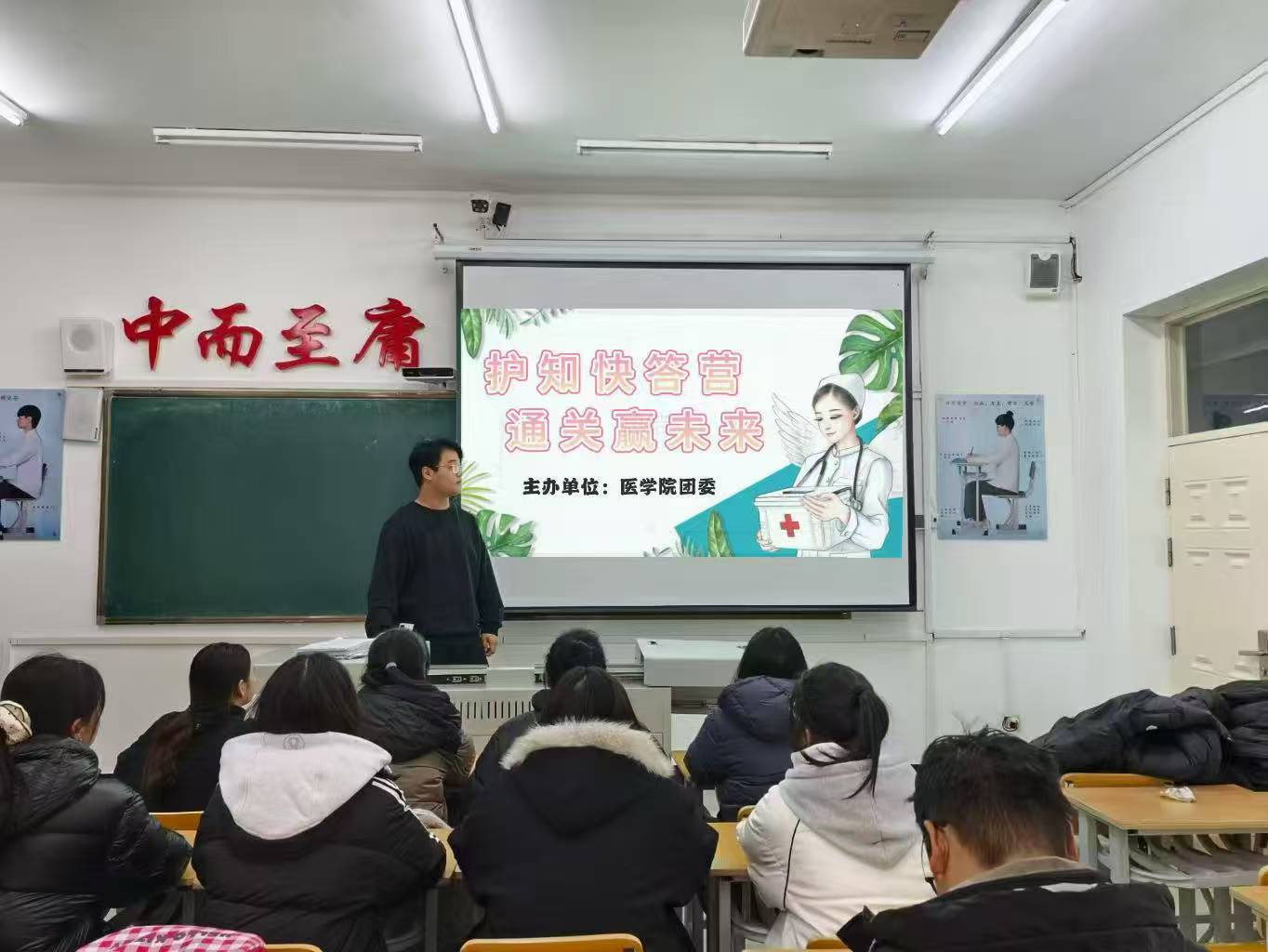 为了帮助护理学生通过梯度化抢答竞技,实现 “以赛助学、以赛促练” 的护考备考目标。医学院团委于10月25日晚在一号教学区1202教室开展“护知快答营,通关赢未来”主题活动。本次活动由纪检部部长柳秋茹组织,医学院部分同学参加。