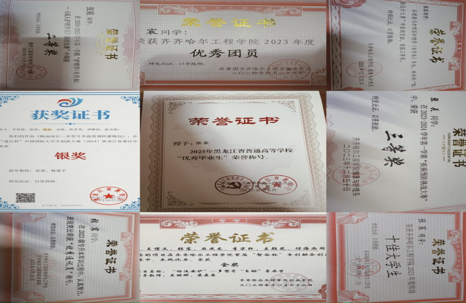 曾获主要荣誉:黑龙江省优秀毕业生、中国国际大学生创新大赛(2024)黑龙江省银奖、黑龙江省优秀志愿者、校优秀通讯员、校优秀团员、十佳大学生、疾病预防挑战大赛三等奖、配餐设计大赛三等奖、校园微视频大赛三等奖、成人护理学课程竞赛二等奖、智谷杯专创融合创新创业大赛金奖。