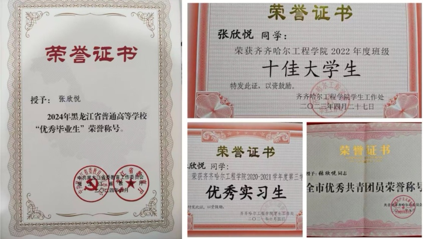 · 思想进步,担当有为:作为一名中共党员,她政治立场坚定,积极进取,荣获“齐齐哈尔市优秀共青团员”称号。她积极承担学生工作,先后担任班级团支书、医学院团总支青工部部长、校新媒体中心图文部部长及新生寝室学长等职务,以高度的责任心服务师生,组织策划多项活动,是老师得力的助手和同学信赖的伙伴。