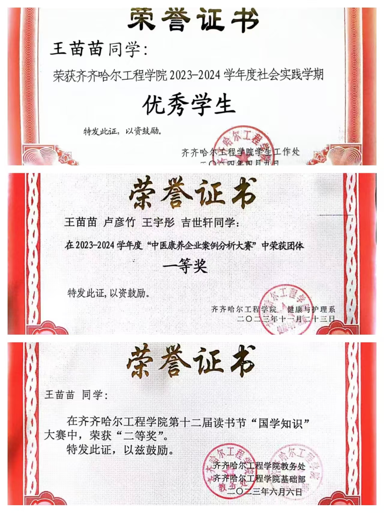 王苗苗积极参与各类专业竞赛,并取得优异成绩:荣获2022-2023学年度“中国居民膳食指南宣讲技能大赛”团体一等奖、第十二届读书节“国学知识”大赛二等奖以及“中医康养企业案例分析大赛”团体一等奖等诸多荣誉。