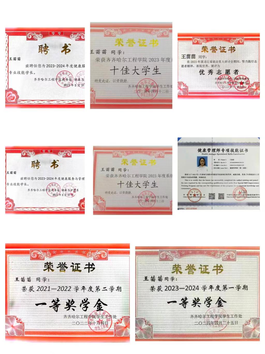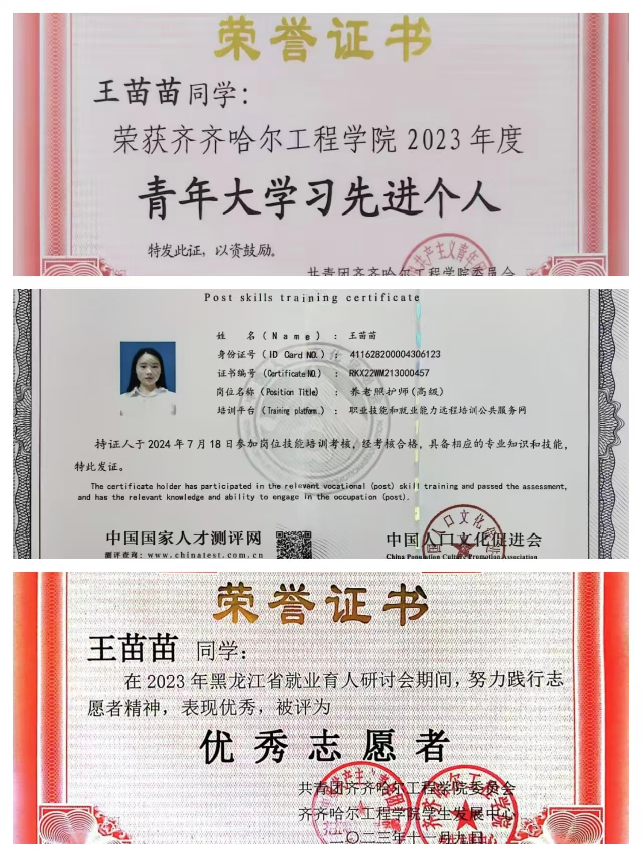 在学习方面,王苗苗同学始终保持着优异的成绩,多次获得国家励志奖学金及校级奖学金。为提升专业能力,她先后取得了多项行业认可的资质证书,像养老照护师(高级)岗位技能证书、健康管理师专项技能证书、公共营养师(高级)岗位技能证书,还有全国计算机等级考试一级合格证书,普通话水平测试等,充分体现了她扎实的专业基础和出色的学习能力。