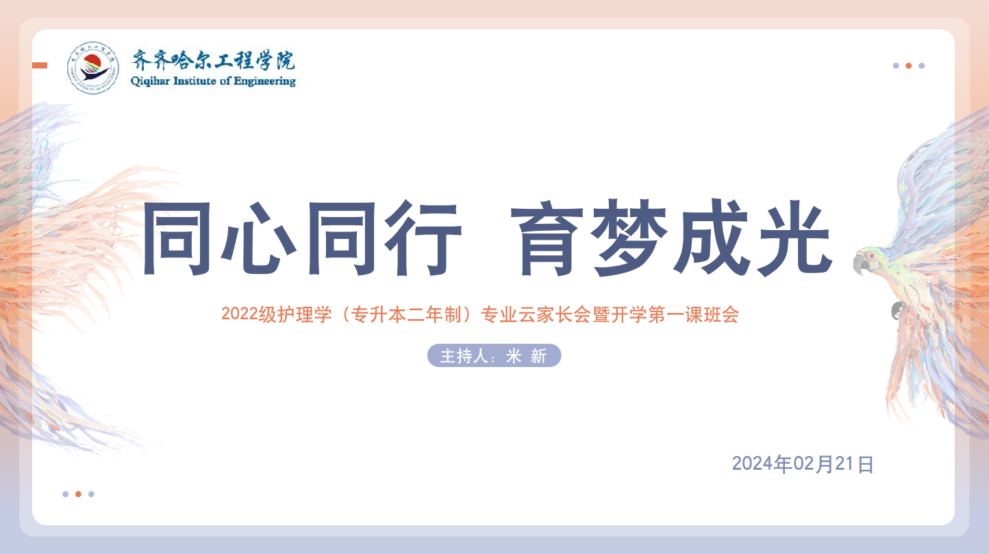 2024年2月21日18时,健康与护理系于腾讯会议为全体2022级护理学(专升本二年制)学生及家长组织开展“同心同行,育梦成光”专业云家长会暨开学第一课班会,本次会议由辅导员米新老师主持,此外还有专业长单大海老师、专业长助理苏森森老师、张蕾老师、冯蕾老师、以及全体护理学专升本教师及生涯导师参加会议。