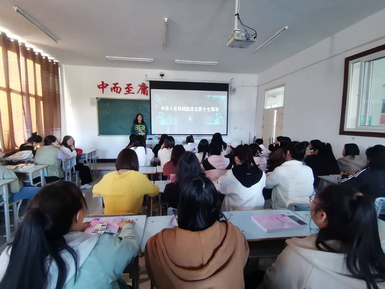 万众欢腾,举国同庆。为庆祖国74周年华诞,祝福伟大的祖国繁荣昌盛。2023年10月20日,健康与护理系助产学211班在1#1204组织开展“庆祝中华人民共和国成立74周年”主题团活。本次会议由团支书钱艺月主持,助产学211班全体同学参加。
