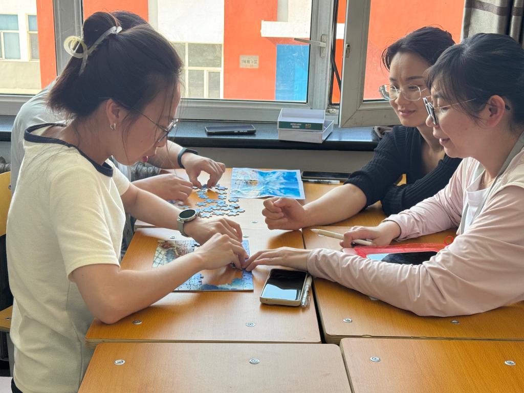 活动以拼图大赛为核心,巧妙地将生涯导师们分为十人一组。各小组在王诺老师的一声令下迅速展开行动。组内成员分工协作,有的负责观察拼图的全貌,寻找拼图的整体框架;有的专注于拼接细节,将一块块拼图紧密相连。生涯导师们各司其职,却又紧密配合,现场气氛紧张而活跃。各小组间也暗自较劲,竞争氛围浓厚。