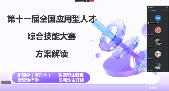 生涯导师张道勇介绍第十一届全国应用型人才综合技能大赛的基本信息,包括竞赛的名称、主办单位、参赛对象、时间安排以及奖项设置等。他提醒学生们特别是要注意选择竞赛的主题,它往往直接关联到需要准备的知识领域和相关技能。