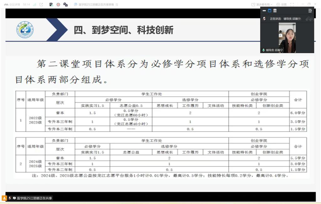 辅导员邱瀚宁老师介绍了“到梦空间”第二课堂成绩单制度。她说明了第二课堂学分的重要性,提醒学生通过参与社会实践、志愿服务等途径获得相应学分,及时关注活动信息,避免因学分不足影响毕业。她同时鼓励学生在活动中提升综合素质。