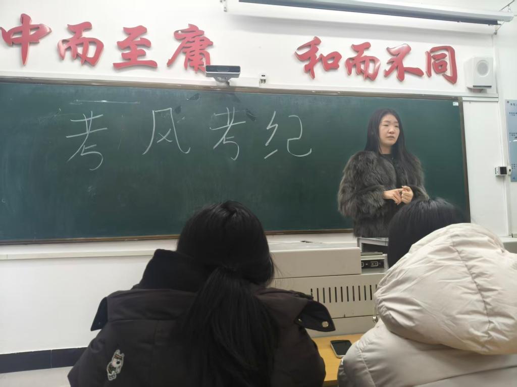 会议伊始,李妍便开门见山,语气坚定地强调了考试中诚实守信精神的重要性,提醒每位学生务必携带身份证和学生证以备查验,并温和地叮嘱同学们保持冷静、不要紧张,以平常心应对考试。