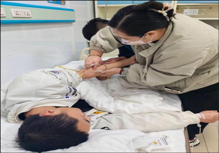 在学生关怀方面,李岩老师将责任融入日常。她常与学生面对面交流,深入了解学习生活情况,及时解答困惑、提供帮助。2025年,生涯学生白晓明突发急性肠胃炎,得知消息后,她第一时间赶往医院看望。在急诊护士静脉穿刺多次未成功、学生痛苦不堪的紧急时刻,李岩老师凭借10年临床护理经验,沉着操作,一针穿刺成功完成采血,为后续治疗争取了时间,也减轻了学生的痛苦。
