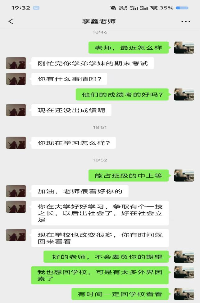 黄缨淼同学向老师表达了真挚的感激之情,感谢老师在高中阶段的悉心教导与关怀。在交流中,黄缨淼同学分享了自己在齐齐哈尔工程学院的学习生活,讲述了丰富多彩的校园活动、专业课程的学习心得,以及面对挑战时的坚持与努力。老师则结合自己多年的教学经验,为黄缨淼同学未来的学业规划和职业发展提出了宝贵建议,鼓励她在大学中继续保持积极进取的态度,不断提升自己。