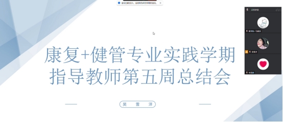为了更好的保证学生专业实践学期实习的安全,更好的明确自己实习目标。康复+健管专业于2023年7月21日18时30分在腾讯会议组织开展专业实践学期总结会。本次会议由专业长吴雪洋主持,康复+健管全部实践指导教师参会。