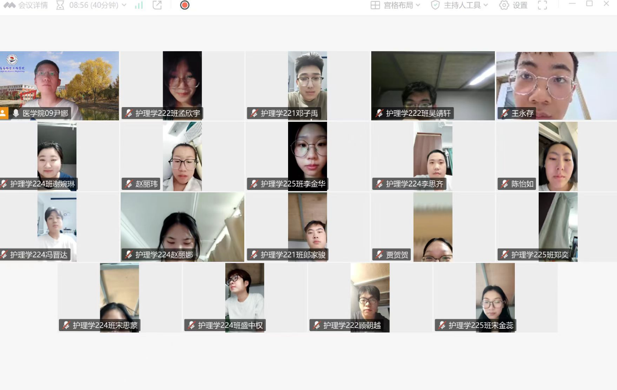 在会议的最后时间,尹娜老师对大家的这一阶段的临床护理实习进行总结,对同学们的作业进行检查并给予高度赞扬,并指出同学们现存问题,提供了改进方向,通过线上会议方式加强了同学们的综合素质。强调现阶段同学们在工作中要注意核对制度和预防针刺伤。同时尹娜老师对同学们的毕业就业也着重强调,提醒同学们着手收集临床案例,告诉同学们招聘的技巧以及简历的制作方式。注意手卫生、注意防晒、防暑措施的过程中也要注意用电、用水安全。