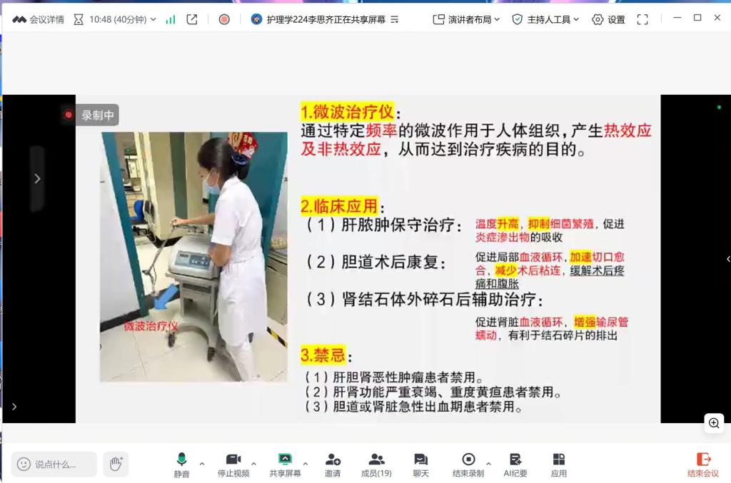 会议开始,李思齐同学首先介绍了8月份全体学生实习科室情况,同学们按分组分别去了骨一、消化科、社区/血透室进行实习,随后李思齐同学简单介绍了骨一的日常工作内容。会议中,李思齐同学分享了微波治疗仪的临床应用与禁忌症并展示了同学们进行的各项护理操作。随后,李思齐、郎家骏、陈怡如三名同学分享了各自的八月份实习体会。最后,李思齐同学分享了一例与肝脓肿有关的真实案例,着重介绍了现存的护理问题,并根据护理问题提出相关的护理措施,使同学们了解了皮肤黄染、尿液颜色异常等护理问题如何护理,使同学们在不断精进护理操作的同时也收获了许多护理临床知识点。