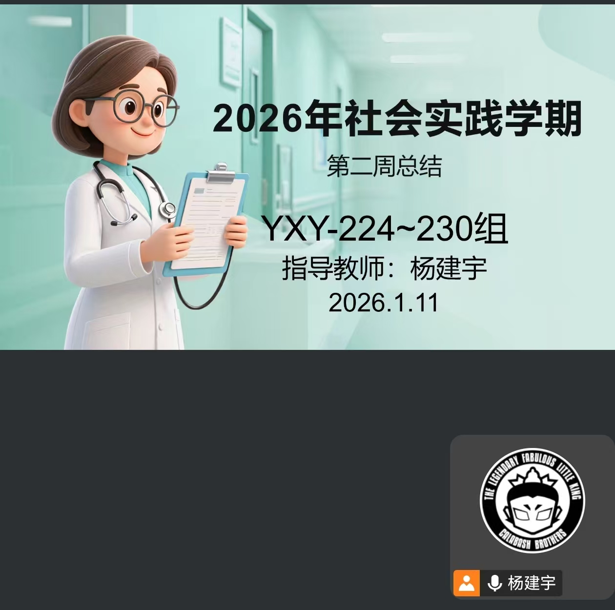2026年1月11日晚,医学院2026年社会实践学期第二周总结会通过腾讯会议平台顺利召开。本次会议由指导教师杨建宇主持,旨在复盘本周实践进展、总结经验、明确后续方向。会上,杨建宇老师首先对各组本周作业完成情况进行了整体回顾。