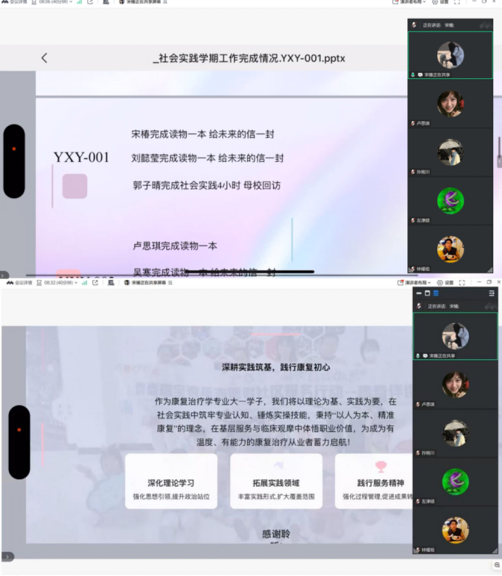 会议伊始,曲官雪老师就强调了安全问题,嘱托同学们在社会实践及母校回访过程中需要注意交通安全,居家时应注意用水用电安全等。随后要求各小组进行集中汇报,内容需包含个人作业完成进度,在完成企业调研报告时需结合康复治疗学专业的课程所学与行业认知展开详实阐述。