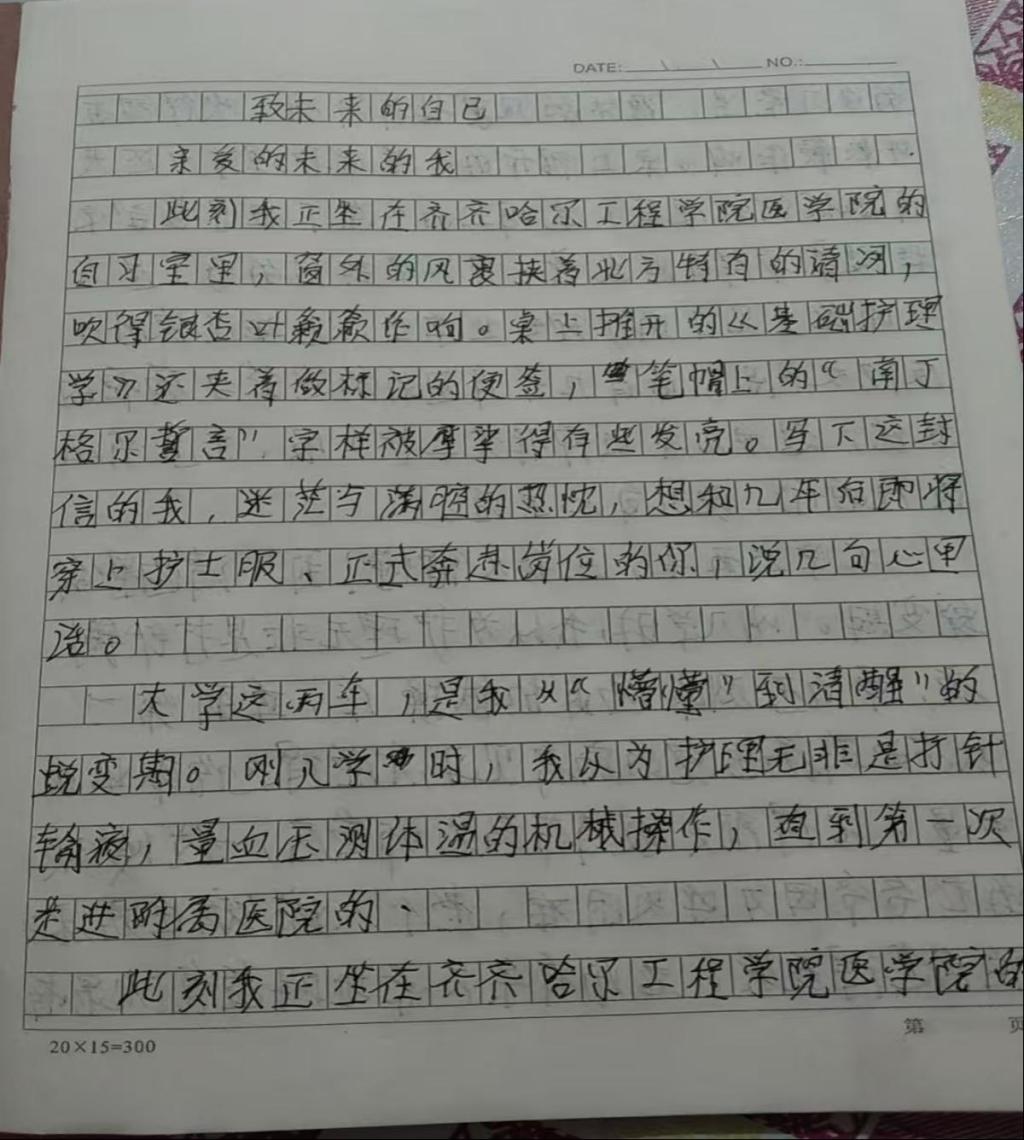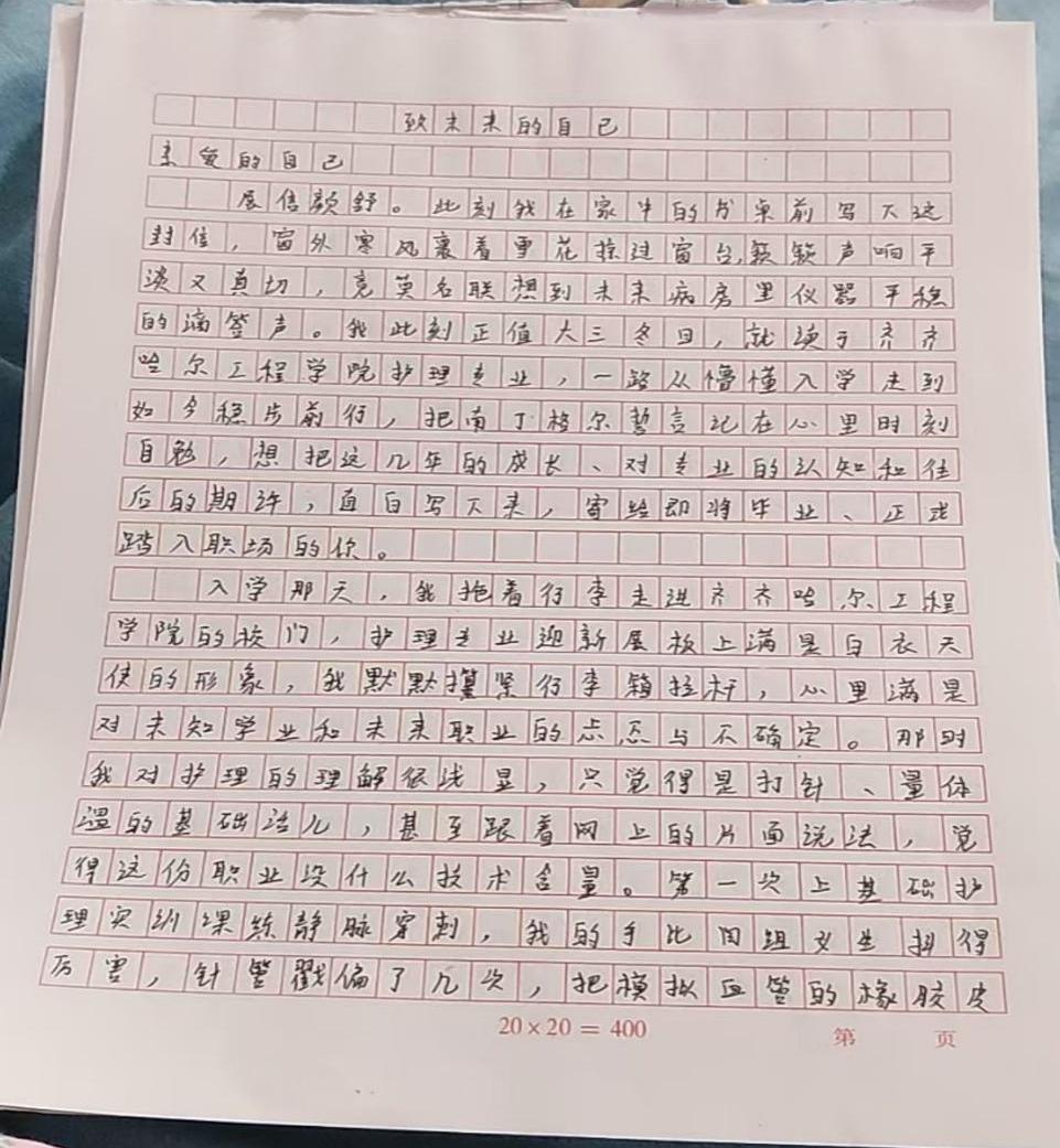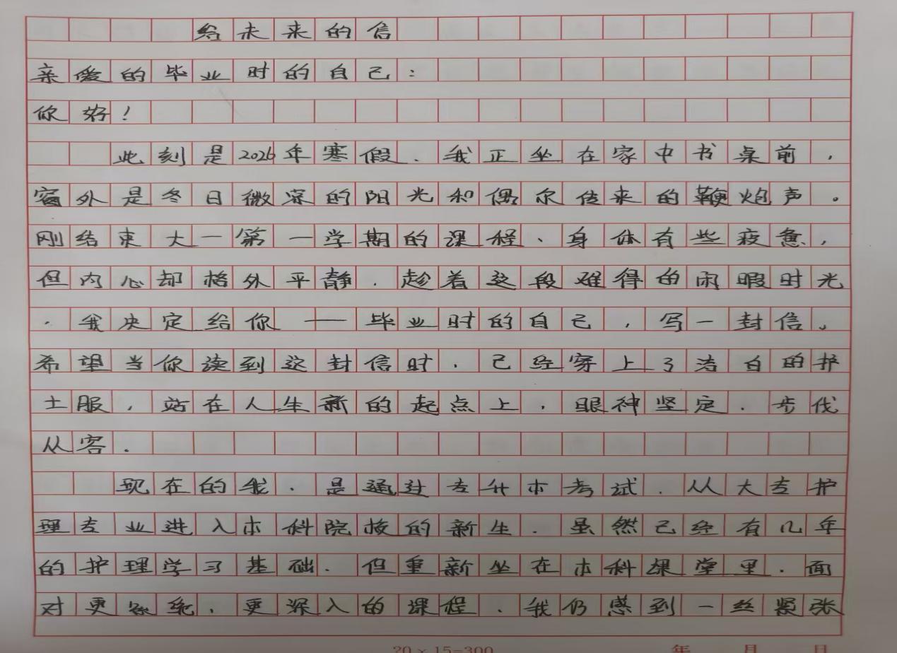 一封封写给未来自己的信,在时光中静静沉淀,记录着护理学子们从懵懂到坚定的蜕变。学生们以文字为纽带,将学习中的疲惫与迷茫、实训中的手忙脚乱、志愿服务中的触动感悟,以及对职业的清晰规划,封存于字里行间。这些书信如同跨越时光的对话,诉说着他们对护理事业的热爱与责任,见证着护理之路上初心与使命的传承。
