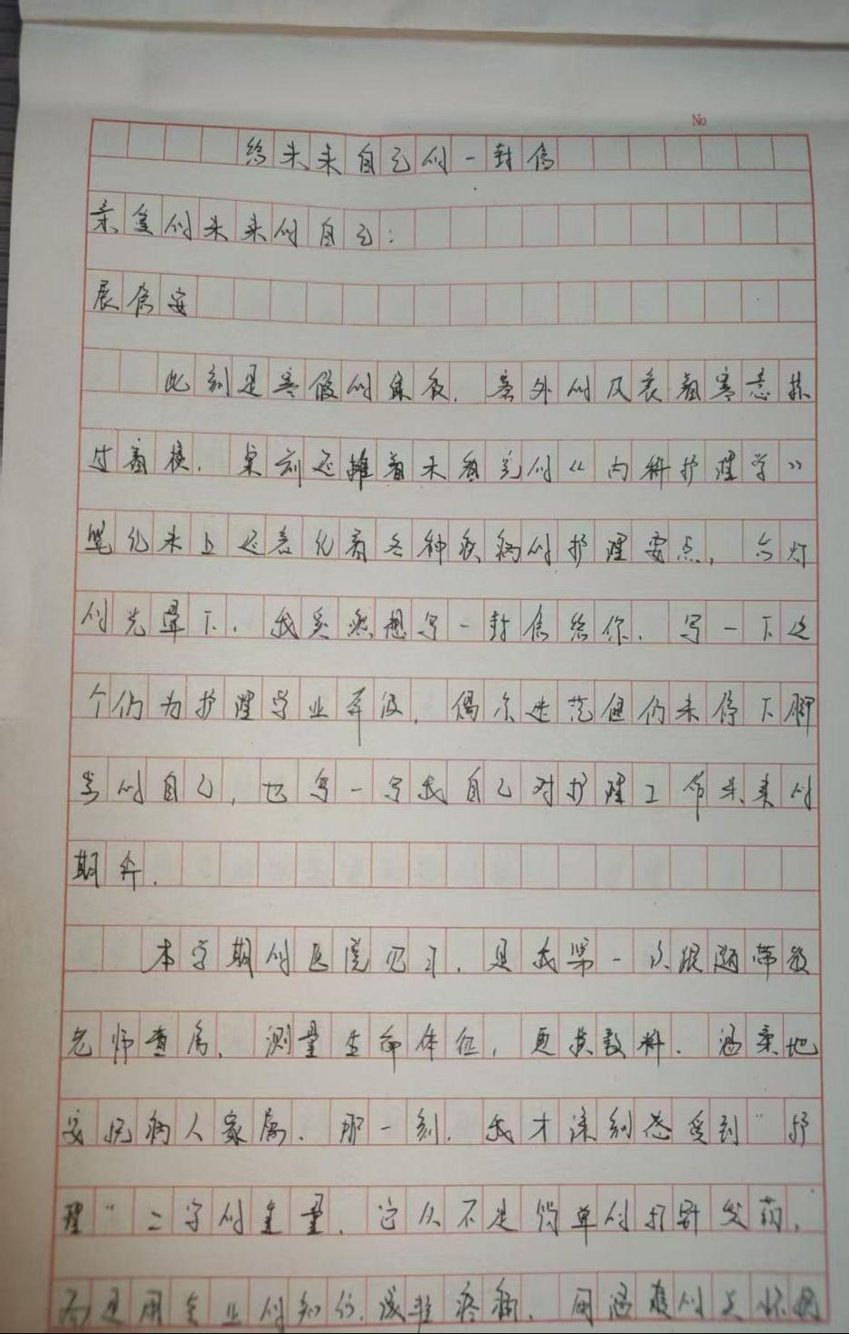 大一学生马立哲在寒假提笔写下致毕业时自己的信时,正值期末考试后的疲惫期。“面对繁重的课业和对未来的迷茫,我选择用书信与未来的自己对话。”他在信中坦言初入护理专业的懵懂,却也满怀期许:“愿三年后的我,不负初心,成为一名有爱心、有责任的护理工作者。”稚嫩的字迹中,透露出他对职业的向往与自我鞭策。