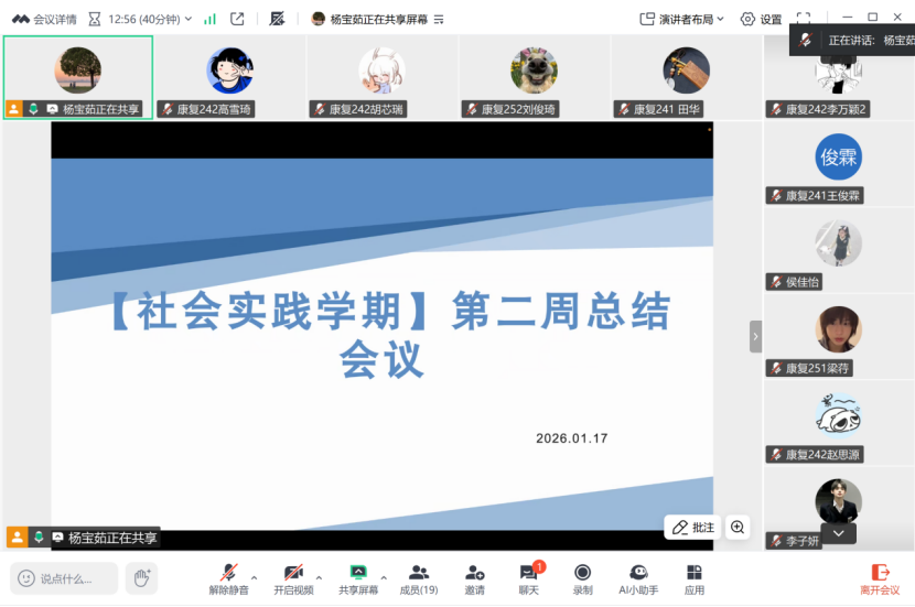 生涯导师杨宝茹首先明确本次会议的核心目的,即复盘第二周社会实践推进情况,梳理现存问题,明确第三周工作重点。强调社会实践需紧扣“理论联系实际”原则,注重过程积累与成果沉淀,要求各小组严格遵守实践纪律,保障实践活动有序开展。同时,每个组的组长进行汇报,并指出了每个人的作业完成进度与不足和改进之处。老师对各小组第二周的实践成果给予肯定,也指出各小组存在的问题具有共性,需高度重视并及时整改。