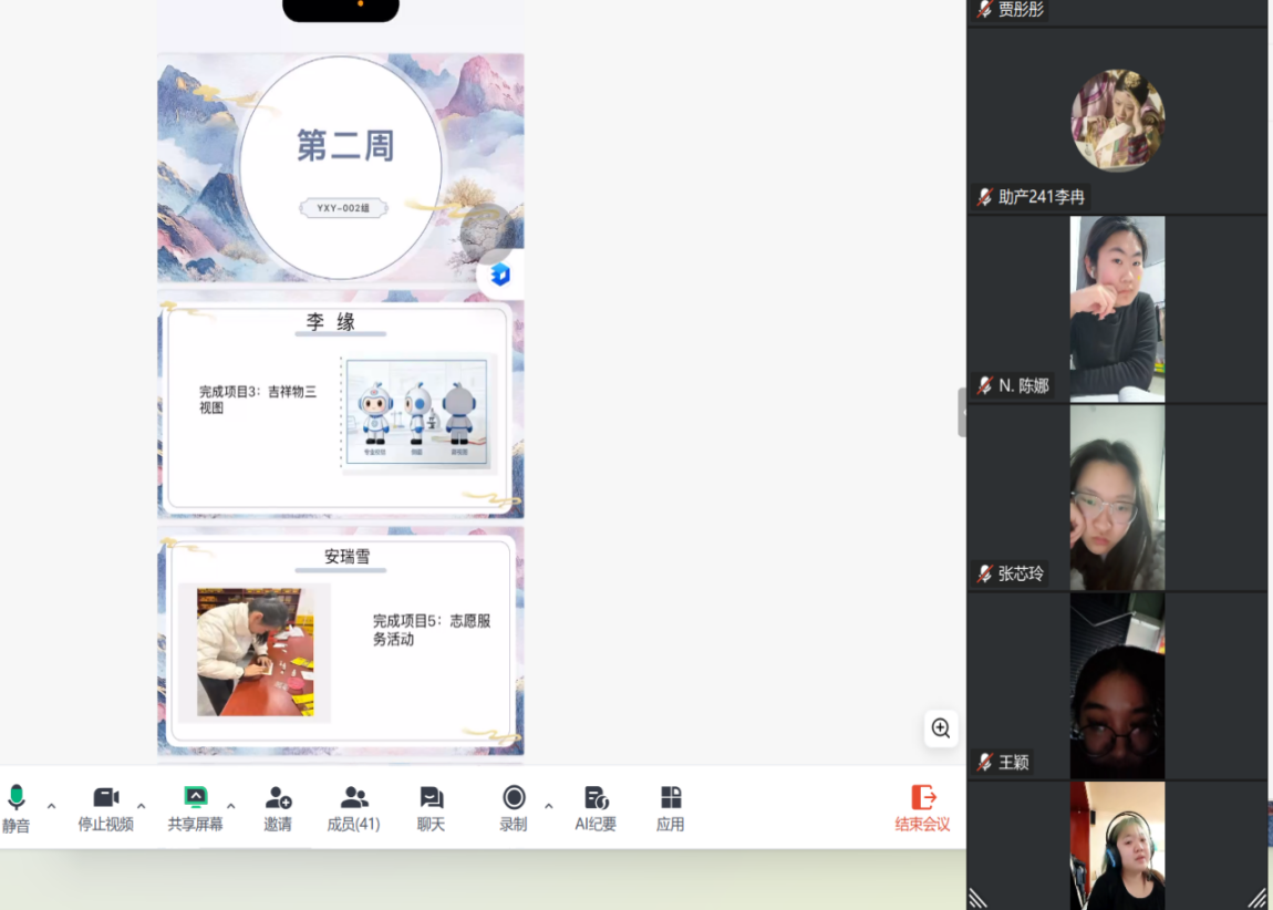 孙玉翡老师于1月18日20时00分在线上开展社会实践学期第二周总结会,全面梳理本周实践情况,规划后续工作。会前,孙老师告知同学们制作汇报PPT,总结各组第二周学习情况。大家深入回顾本周实践的点点滴滴,精心整理实践成果、提炼关键要点,为在会上清晰汇报学习情况做足准备。