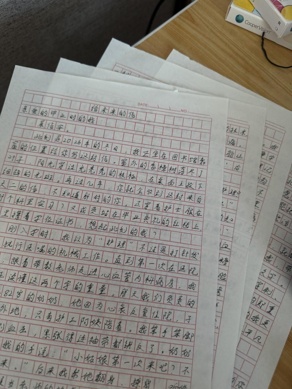 姜杨同学写了回顾了校园学习与实训经历,表达了对成为一名合格护士的期待,也流露出对未来职业道路的思考与决心以护理专业学生的视角出发,回顾在校的理论学习与临床实训经历,强调了对护理职业的热爱与救死扶伤的初心成为一名优秀护士的坚定信念。
