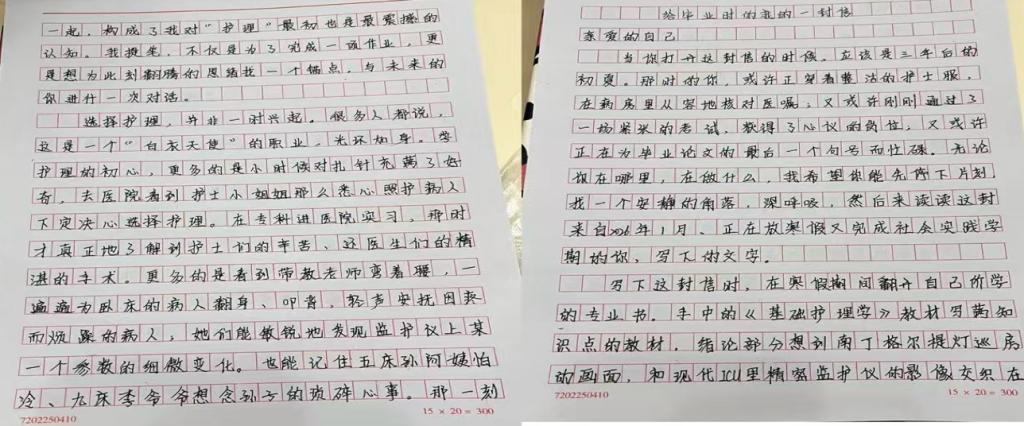 李美静同学写致未来的自己:愿你始终怀揣护理人的温柔与坚定,专业上精益求精,练就过硬本领;生活里心怀暖阳,不惧前路风雨。保持对生命的敬畏,对职业的热爱,以微光之力护佑安康,在平凡的岗位上,活成自己想要的模样。