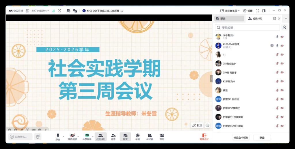 为进一步明确社会实践学期第三周任务要求,确保各项作业有序推进,米冬雪老师于2026年1月24日晚组织召开第三周线上工作会议,全体参与社会实践的学生在线参加。