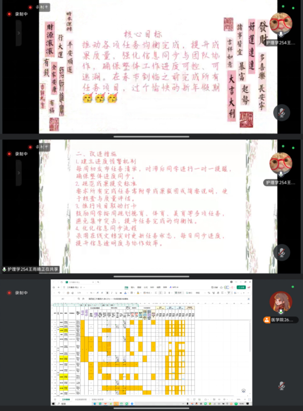 紧接着,王雨晴同学在分析完目前的工作进度后,给出了接下来工作的核心目标,并陈列出数条用于提升同学们任务进度的改进措施,明确提出了建立进度预警机制、规范成果提交标准等建议,对大家极有帮助,可行性很强!