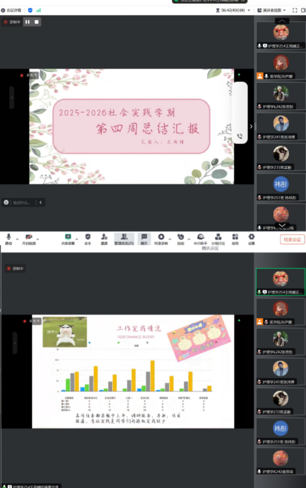首先,本次会议由176组的王雨晴同学进行汇报。会上,王雨晴同学根据工作量表,对比、分析并总结了同学们本周的任务进度,制作出能够体现任务完成进度的柱状图,展示了176组邢嘉怡同学参加社会志愿服务的图片、青春FUN肆拍项目中部分同学的优秀作品等重要的工作成果,同时发现调研报告、走访记录、专业实践项目进展较慢,并督促同学们积极落实该部分的任务!