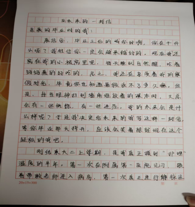 在社会实践学期中,YXY-312组的辛思睿、段梦奇和王诗博三位同学圆满完成了相应任务,并分别写下了给未来的自己一封信。字里行间,有对未来职业的无限期许,也有对自身能力的些许忐忑,但都坚信能在平凡的社区岗位上,走出属于自己的闪光之路。