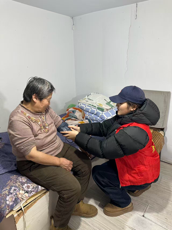冬日清晨,雪花覆满街巷,卢佳楠主动加入社区健康志愿服务队,走进社区开展血压测量公益服务。在社区服务点,卢佳楠有条不紊地为居民登记信息、测量血压,对血压异常的居民及时提醒就医,并讲解日常控压的注意事项。寒风虽冷,她却始终保持热情与耐心,用专业技能为居民的健康保驾护航,让社区居民感受到青年学子的温暖。
