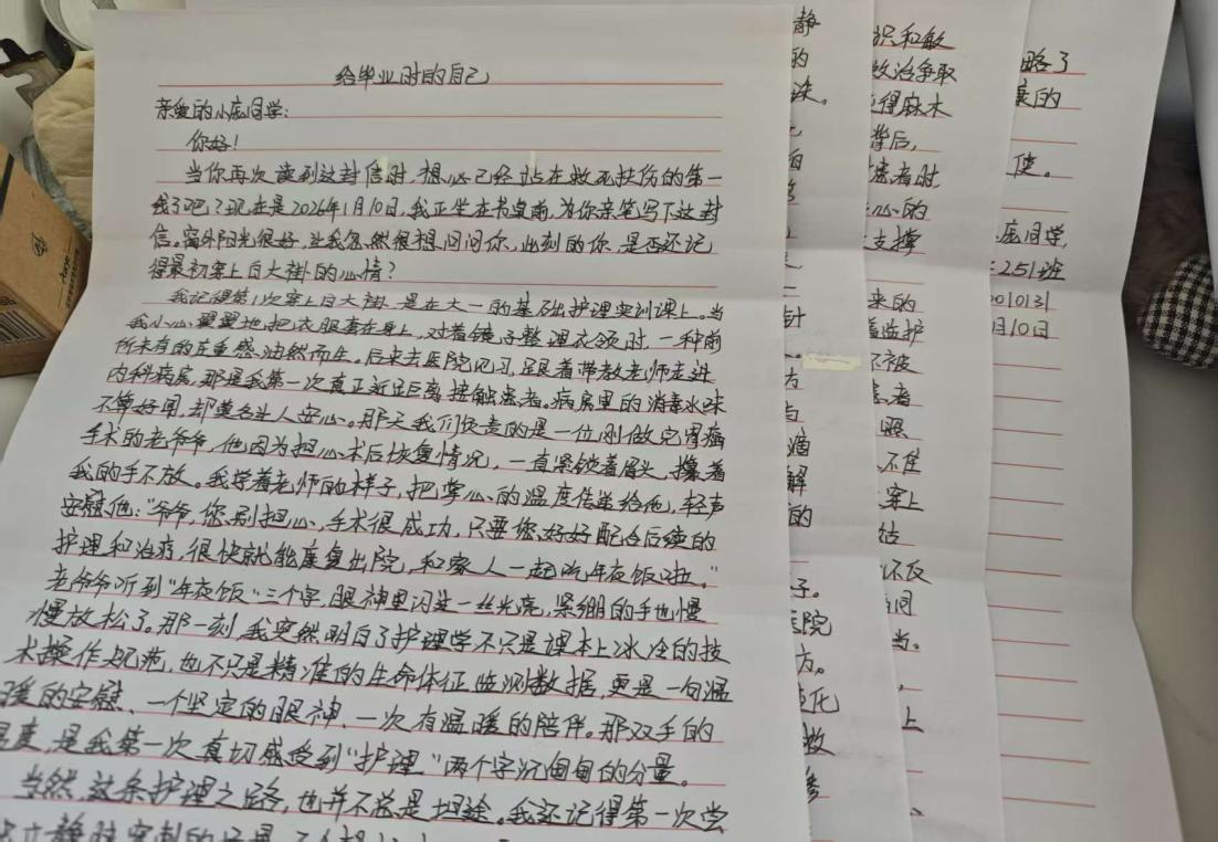 护理学251班的庞琛琪表示,大一上学期是打基础的关键阶段,从文化课的学习到护理专业的初步接触,让她真切感受到护理学科的严谨与厚重。这段时间里,她不仅收获了知识,更学会了合理规划时间、独立解决问题。在写给未来的信中,她定下目标:未来将始终保持踏实的学习态度,扎实掌握每一个专业知识点,勤练护理实操技能,积极参与专业实践活动,努力提升综合素养,以严谨的专业态度、温暖的服务意识,朝着优秀护理工作者的方向稳步前行。