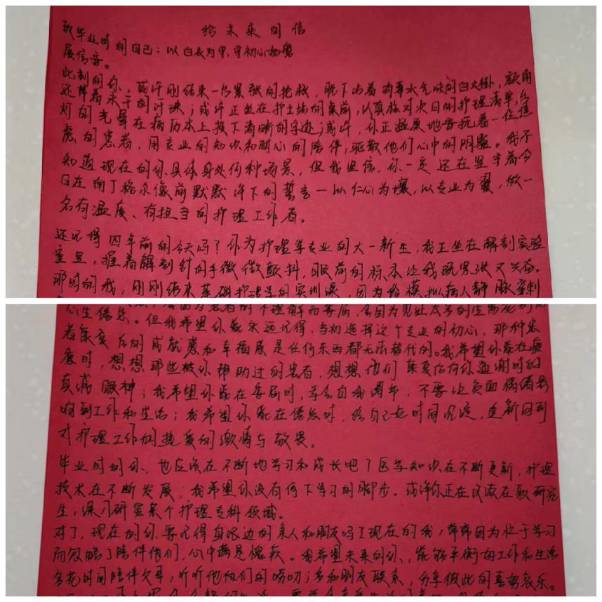 一纸信笺,承载初心;万般期许,皆为前行。此次“给未来的一封信”主题活动,不仅让小组成员在回望中总结成长,更在期许中明确方向。在未来的大学生活中,这支充满朝气的护理学子小组,必将以坚定的信念、踏实的行动,践行护理使命,深耕专业学习,在成长的道路上稳步前行,努力将自己培养成为符合时代要求的优秀护理人才,用青春与汗水书写属于护理学子的精彩篇章。相信这四位同学定会以信为约,以梦为马,笃行实干,在护理专业的学习道路上不断探索、持续进步,以扎实的专业本领、坚定的职业信念,奔赴属于自己的美好未来,努力成为守护生命健康的合格护理人。