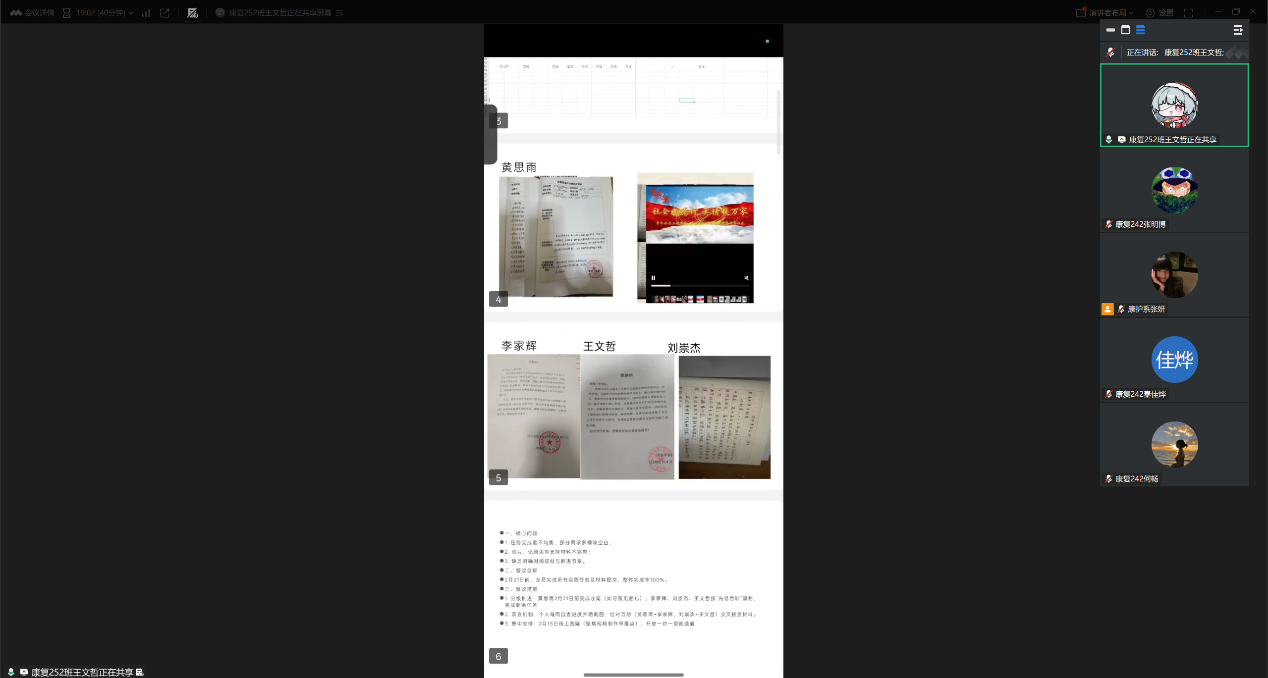 各小组都列出了社会实践学期个人完成情况的完整表格,个人完成情况一览无余,线上内容创作、吉祥物设计、给未来的信等任务完成最多。同时每个小组也汇报了未来的改进措施例如将在剩下的时间里如何完成,何时完成剩余任务给出了详细计划。张妍老师本周主要明确了专业任务,对如何更好的完成任务提出建议,并提出最好要在第六周完成收尾工作。
