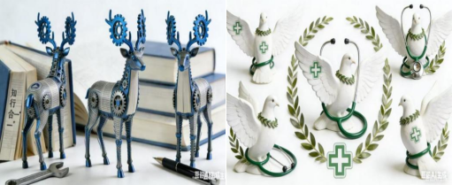 陈祎彤同学从《设计人类学》和《护理学基础》中汲取灵感,设计了两款吉祥物:学校吉祥物以白鸽为原型,翅膀上清晰的十字纹路、胸前垂落的听诊器,传递出医者的专业与爱心,展现出角色轻盈灵动与医者仁心的气质;专业吉祥物则以齿轮鹿角闪耀科技感,书本纹理的身体设计,彰显出扎实的学术底蕴。