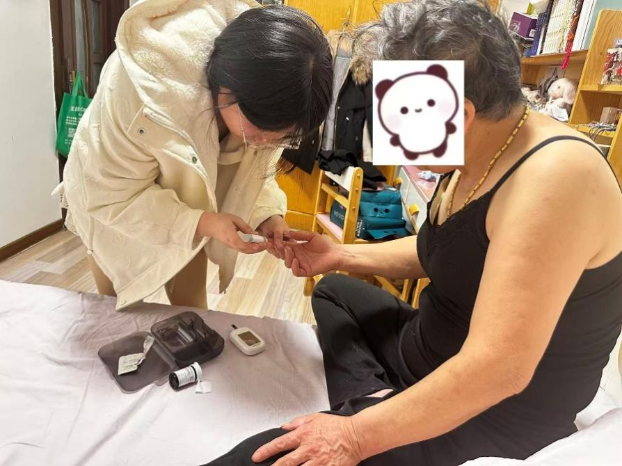 邢嘉怡同学来到当地红旗社区,随社区工作人员一同上门,为行动不便的居家老人提供血压测量、血糖检测等基础健康服务,切实缓解了社区老年群体因年迈、行动受限而面临的就医难题。