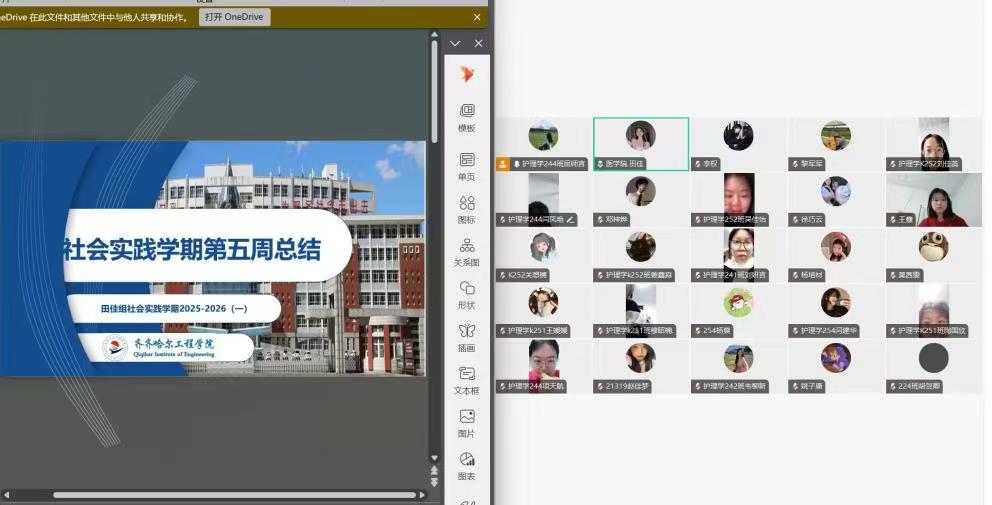 本次社会实践中期线上总结会议的召开,不仅完成了第五周实践工作的全面复盘,更及时为各小组后续的设计完善工作指明了优化方向,有效解决了中期推进中的各类堵点难点问题,进一步夯实了社会实践高质量推进的基础。参会同学纷纷表示,将认真落实田佳老师的建议,以更加严谨的态度和扎实的行动推进后续实践,在实践中深化专业认知、锤炼实践能力,彰显护理学子的专业素养与青春担当。